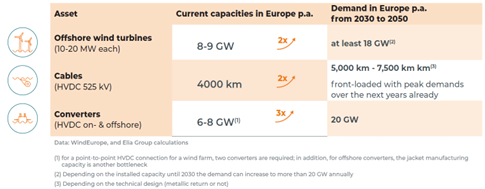 The table below compares the current manufacturing capacities for three types of assets in Europe with their projected annual levels of demand between 2030 and 2050. The numbers show that the production capacities for all three asset types must be significantly increased to satisfy all of Europe’s needs via domestic suppliers only.