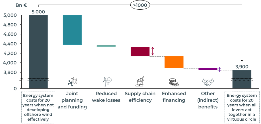 - From 2030 to 2050, international collaboration, the de-risking of investments and spatial planning in offshore wind development could lower the cost of the energy transition in Europe by more than 1,000 billion euros.